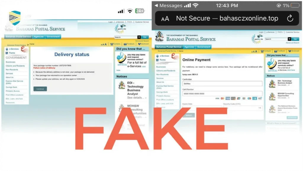 Reported screenshots of smishing text messages from malicious actors containing spoofed URLs and strange hyperlinks Spoofed version of Bahamas Postal Services’ website soliciting payment information.